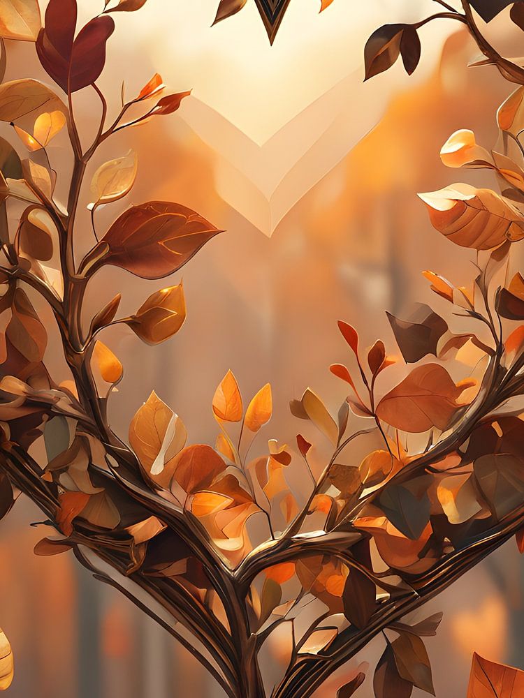 This image shows an autumn scene in which branches and leaves gracefully form a heart shape. The warm, orange and brown tones of the leaves create an intimate and soothing atmosphere, perfect for an autumn décor. The art style contains elements of both naturalism and surrealism, with a strong emphasis on details in the leaves and branches that exude an almost magical harmony. The soft lighting and subtle shadows in the work create a sense of depth and space, making it feel alive and inviting.