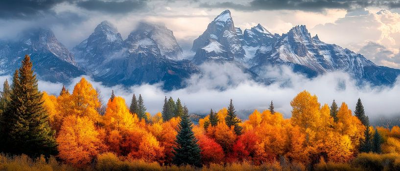 A breathtaking autumn panorama unfolds, where glowing, golden and orange deciduous trees gently stand out against the majestic, snow-covered peaks. The mystical mist caresses the mountain landscape and conveys a sense of calm and grandeur. Ideal for the living room, this work of art brings a harmonious connection to nature into your home.