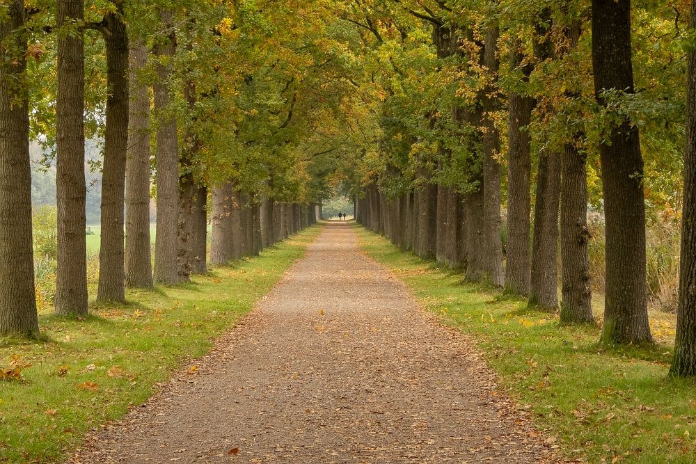A beautiful autumn scene, an avenue of trees and walkers in the distance.