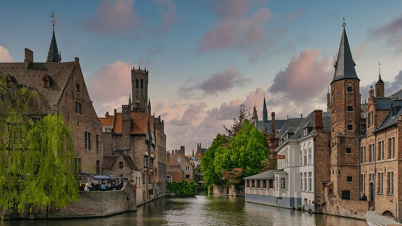 This photo shows a tranquil moment along Bruges' canals, where medieval facades, towers and calm water combine to form a timeless cityscape. The soft evening light and light clouds give the scene a calm, almost picturesque atmosphere.