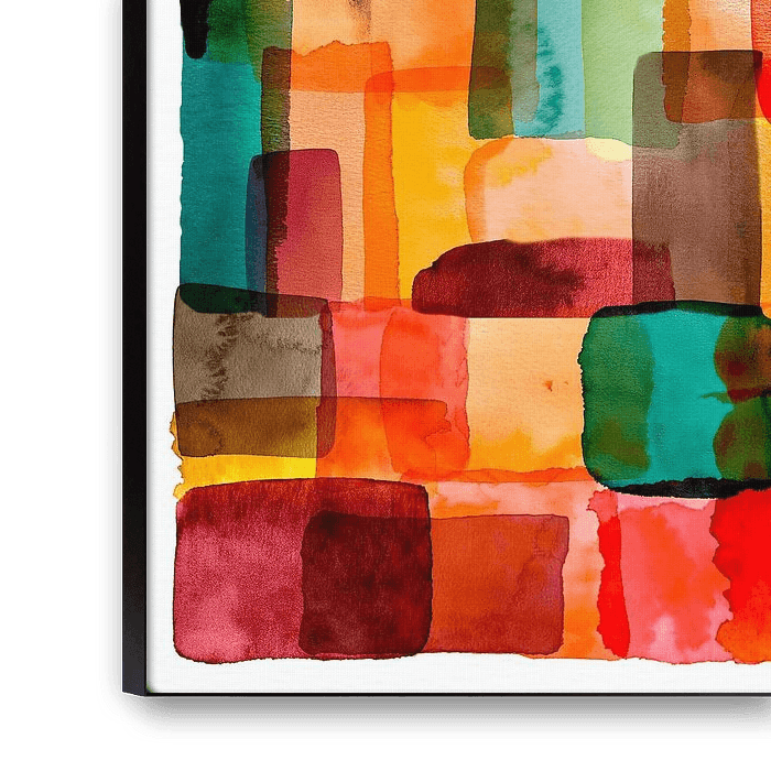 BASIC is a colorful and abstract watercolour painting in which transparency and depth reinforce each other. The soft, overlapping planes form a harmonious whole of warm colours — from ochre yellow and caramel to red, turquoise and deep brown.