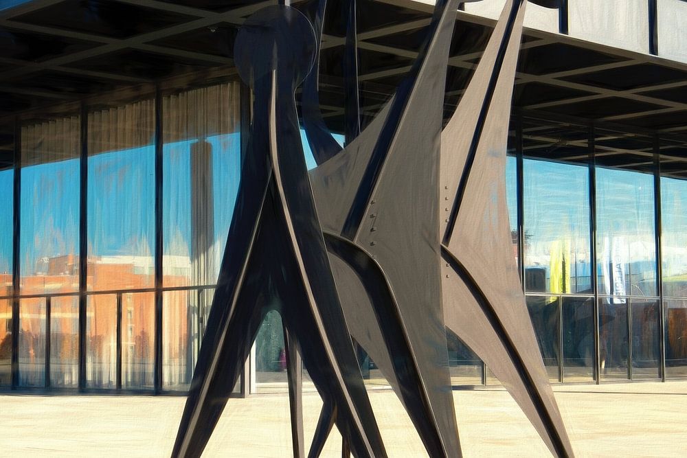 The Neue Nationalgalerie in Berlin, Germany. Subsequent image processing of the Nationalgalerie with the sculptures in front created a painterly effect.