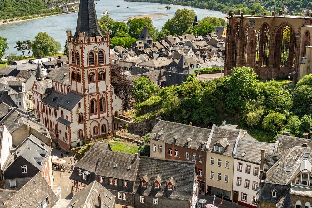 Bacharach with Saint Peter's Lutheran Church, the ruins of the Gothic Werner Chapel and the Rhine river seen from above, world heritage Upper Middle Rhine Valley, Rhineland-Palatinate, Germany | Aerial view of Bacharach with Saint Peter�s church, Werner Chapel ruins and Rhine river, world heritage Upper Middle Rhine Valley, Rhineland-Palatinate, Germany