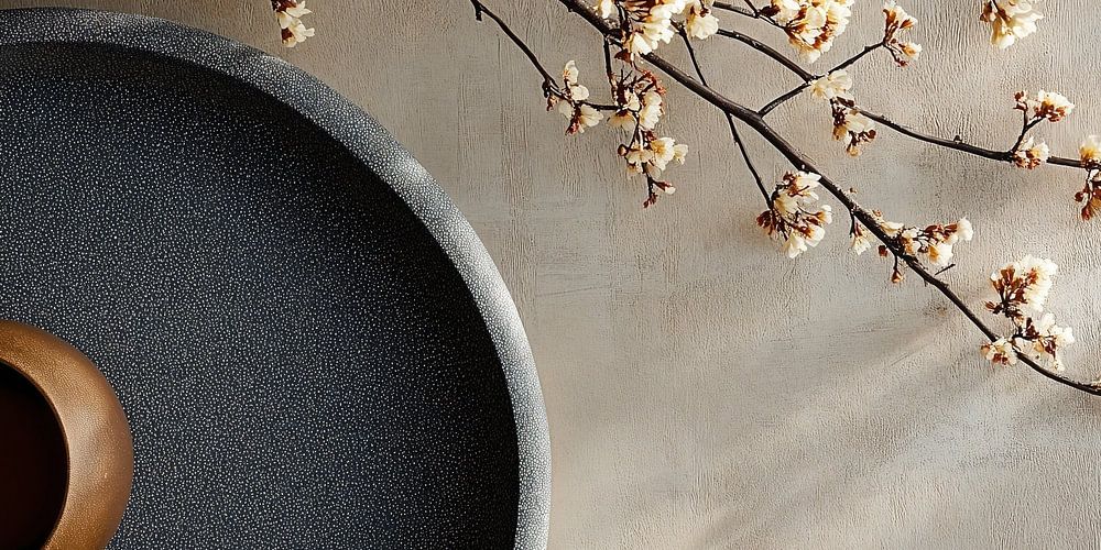 This serene still life embodies Japandi style and feng shui principles. A black ceramic bowl with two brown bowls forms a balanced contrast with a branch of cherry blossoms. The neutral background enhances the peace and harmony. This composition evokes inner calm and illustrates how sturdy ceramics and fragile blossoms can merge into a harmonious whole. The image invites contemplation on the beauty of simplicity and the power of natural elements in design.