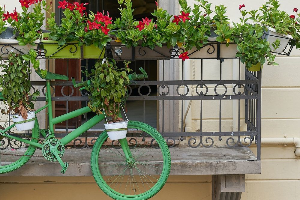green bicycle with plants as decoration on a balcony in the old town of Malcesine in Italy. This balcony with the bicycle was just opposite my hotel room. Malcesine is a popular destination and holiday resort for many tourists from all over the world during the summer season