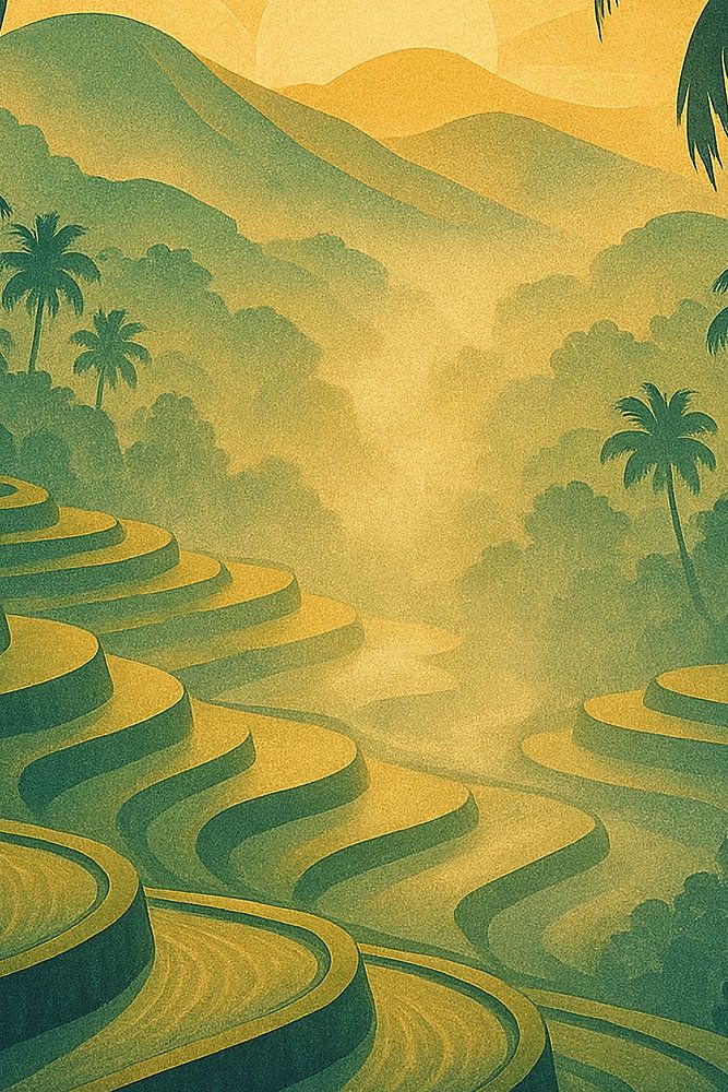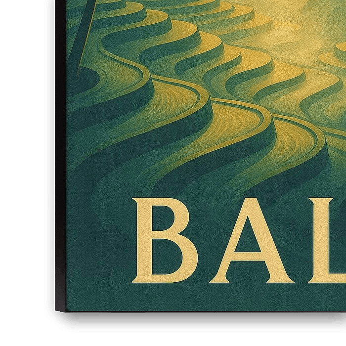 Bring the tranquility of the Ubud countryside into your home with this radiant vintage poster of Bali’s rice terraces. The artwork beautifully stylizes the famous Tegallalang landscapes, featuring sweeping, curved lines of green paddy fields that cascade down the valley. Tall, slender coconut palm trees frame the scene, their fronds…