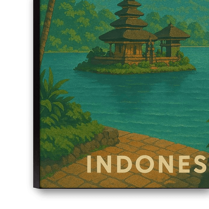 Tropical elegance and mystical beauty merge in this colourful depiction of Bali. The lush palm trees and majestic volcano in the background invite you to daydream of faraway places and relaxation. Ideal for the living room, this artwork brings the feeling of holiday and adventure right into your home.