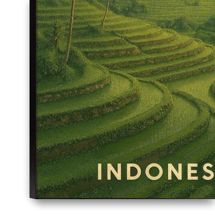 A gentle sunrise illuminates the green rice terraces, while the majestic silhouette of a volcano towers in the background. Palm trees sway in the wind and invite dreamy thoughts of faraway holidays. This harmonious work of art brings a relaxing atmosphere to any living room and is reminiscent of the beauty of exotic holiday destinations.