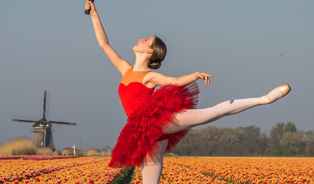 Ballerina in 't Zand , met op de achtergrond Molen O-T en de tulpenvelden.