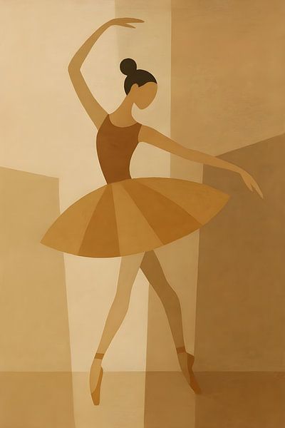 An abstract ballerina, modern and minimalist, rendered in warm earth tones. Soft shades of beige and brown flow into each other, capturing the essence of movement and balance without forcing details. The shapes are subtle and powerful at the same time: an understated silhouette that suggests elegance rather than explaining…