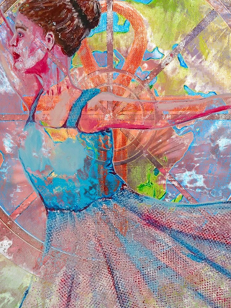 Digital Art of a Ballet Dancer. A mix of own original paintings. The dress of the dancer has a blue and red color.