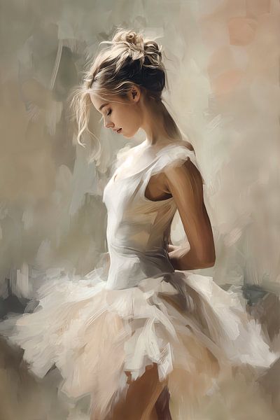 This painting captures the ethereal beauty of a young ballerina in a pure white tutu, her elegant profile lost in contemplation. With soft, flowing brushstrokes and a warm, neutral color palette of beige, ivory, and soft gray, the artwork creates an atmosphere of classical grace and introspective stillness. The playful, flowing locks…