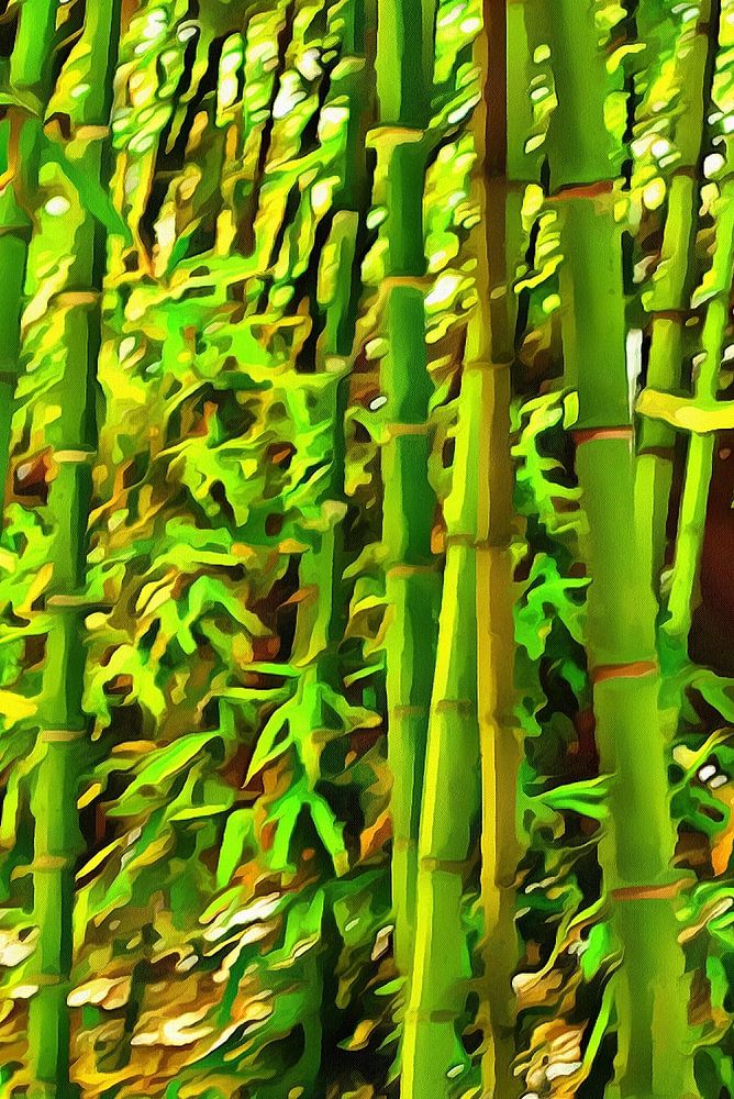 In the Jardin Majorelle in Marrakech, Morocco, giant bamboo provides fabulous shade from the hot sunshine. A photo art image suggesting the cool, green shade provided by the planting.