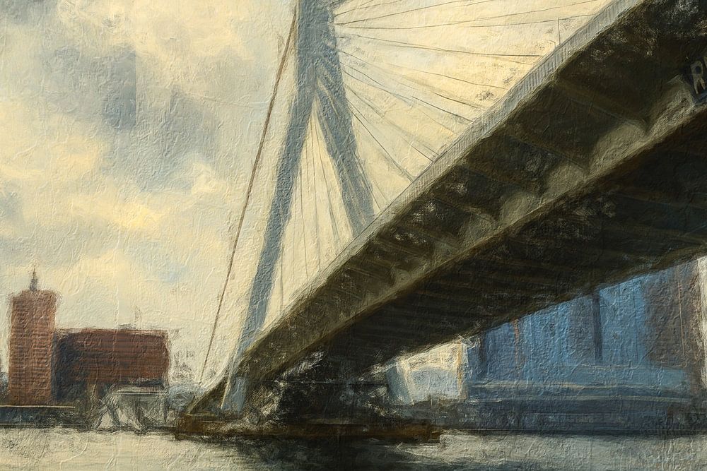 In this painting, I tried to capture the unique atmosphere and energy of Rotterdam. The imposing Erasmus Bridge, with its elegant lines and impressive construction, is the powerful centrepiece of the scene. It stretches across the water as a symbol of connection and progress, while the cloudy sky above it evokes a dramatic, almost poetic atmosphere. The reflections in the water and the surrounding modern buildings reinforce the sense of a city that is constantly moving, yet has moments of calm and beauty.
