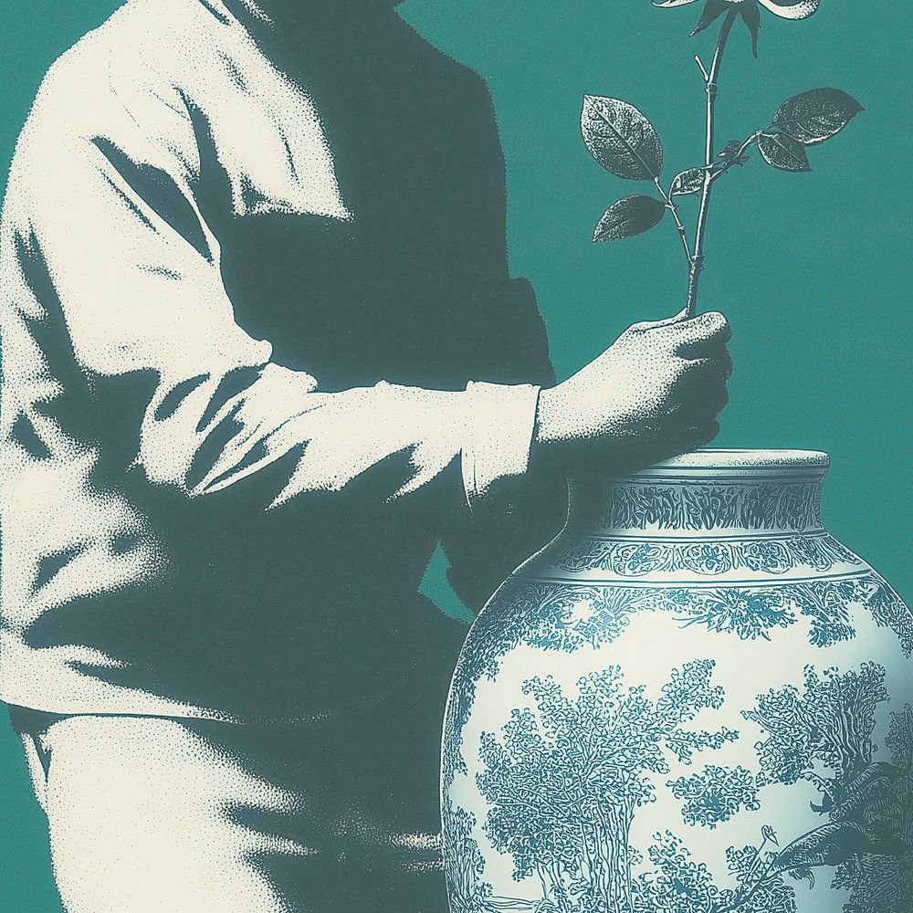 and masked hooded and caped street urchin boy reaches for a white rose from a classic vase. He seems to bring a message of peace rather than protest - tenderness hidden in rebellion.