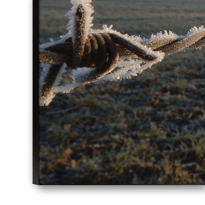 Buy this landscape artwork Barbed wire with hoarfrost by Joke te Grotenhuis on canvas, ArtFrame, poster and wallpaper, printed on demand in high quality.