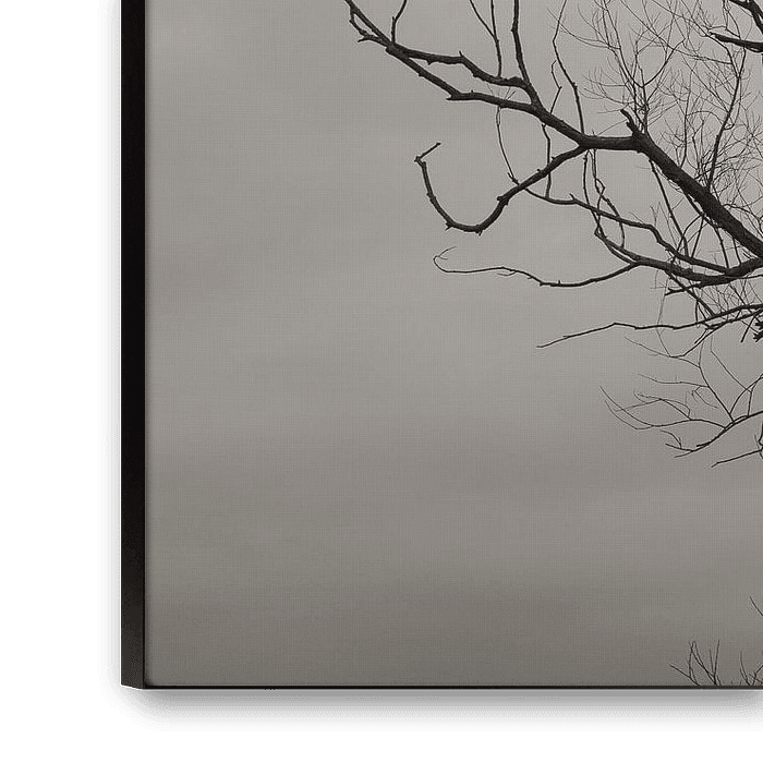 A winter scene of trees without leaves with lots of clouds in the sky. It is winter and the trees are bare. The weather gives a dramatic and also mysterious atmosphere to the picture. The image has