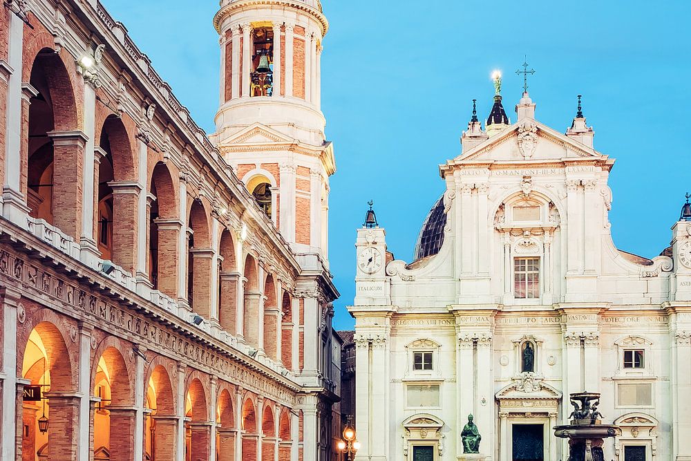 A twilight view of the Piazza della Madonna and the Basilica della Santa Casa in Loreto, Italy.