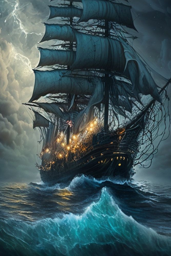 The artistic image shows a large ship being lashed by high waves and strong winds in a storm. The sea is wild and churning, and the dark clouds in the sky convey a threatening mood. The ship is struggling against the elements and you can literally feel the tension and chaos on board. The artist has painted the picture with bold brushstrokes and bright colours, giving the storm an almost surreal atmosphere.