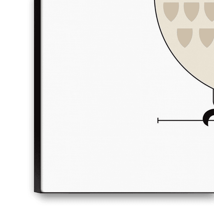 This is a charming and modern illustration of an owl, rendered with clean, crisp geometric shapes and a flat design aesthetic. The owl features a striking color palette of muted creams and grays for its body, contrasting with dark charcoal for its wings and head tufts. Its large, bright yellow eyes with black pupils give it an alert and intelligent expression. Subtle details include cream-colored chest feathers depicted as overlapping scales, a touch of red on its chest, and a vibrant blue accent on its wing, adding a unique splash of color. The owl is depicted perched on a thin, dark line, isolated against a clean white background, highlighting its contemporary graphic appeal.