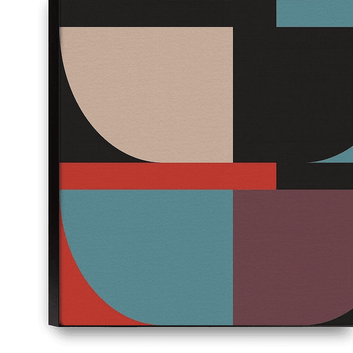 This modern abstract artwork features basic geometric shapes and clean lines in a retro-inspired style. Crisp circles, blocks, and dynamic forms are arranged with balance and rhythm, drawing inspiration from Bauhaus, architecture, and abstract expressionism. The color…