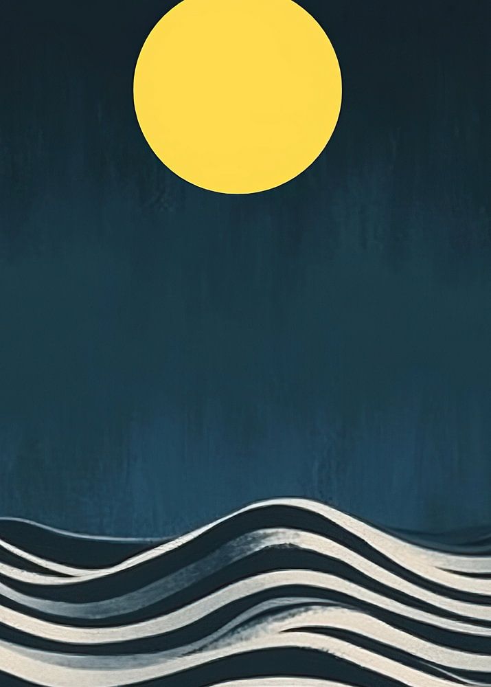 A minimalist Bauhaus illustration of the sea at night in the style of a woodcut, with striped waves and a yellow sun in the empty sky. The design is simple yet powerful, using only black lines on white paper to create depth and texture. It is perfect for adding personal touches or creating unique prints that convey emotions such as serenity, hope, love, happiness, contemplation, melancholy, freedom, calmness, introspection, vastness and tranquillity.