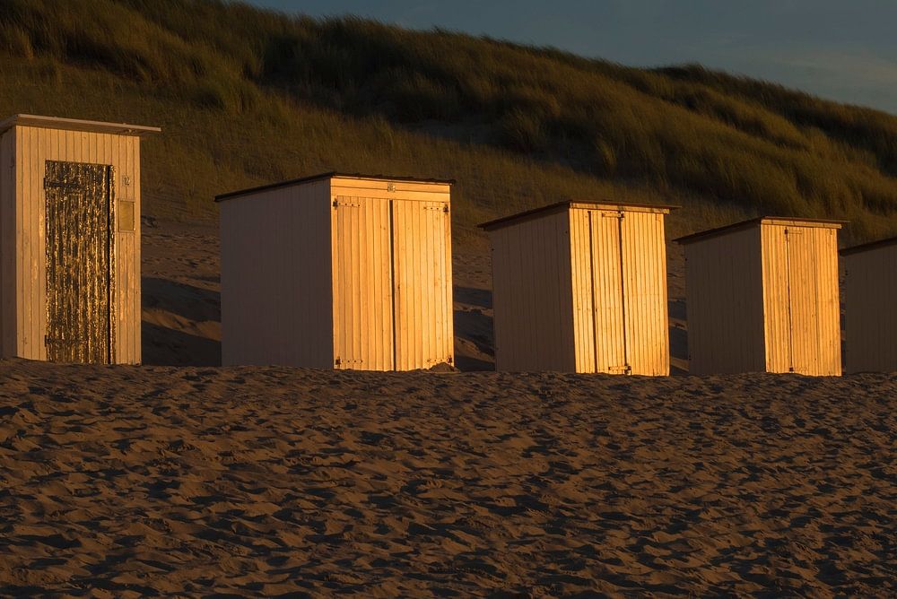Beach houses with sunset in the doors. Abandoned beach. Beach cottages that complete your beach house. Casual and wide. Made on a beach lying on the North Sea.