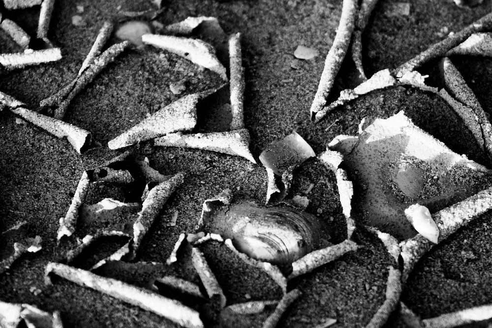 Scattered among these folded sand patterns are small shells, some nestled in the crevices and others perched on the ridges. The monochrome palette emphasises the contours and textures of the shells, making them stand out as small, intricate details in the otherwise uniform sand landscape.