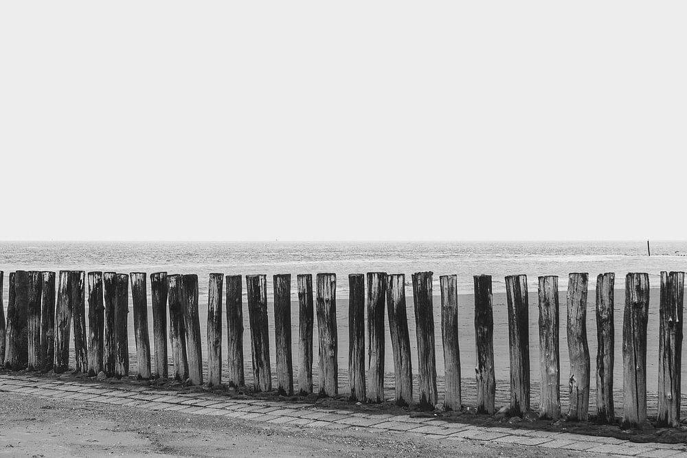 Black and white shot of the beach in Cadzand. The horizon of our North Sea can be seen in the distance.