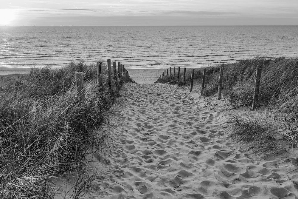 Buy this landscape artwork Beach, wind and sea in black and white by Dirk van Egmond on canvas, ArtFrame, poster and wallpaper, printed on demand in high quality.