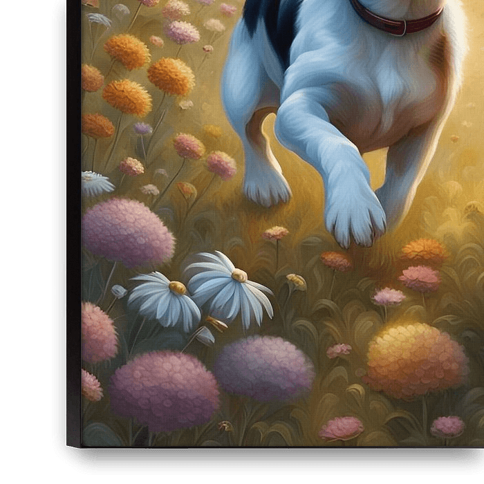 Buy this digital art artwork Beagle playing in a Flowerfield 2 by Johannas Art Creations as a reproduction on canvas, ArtFrame, poster and wallpaper, printed on demand in high quality.