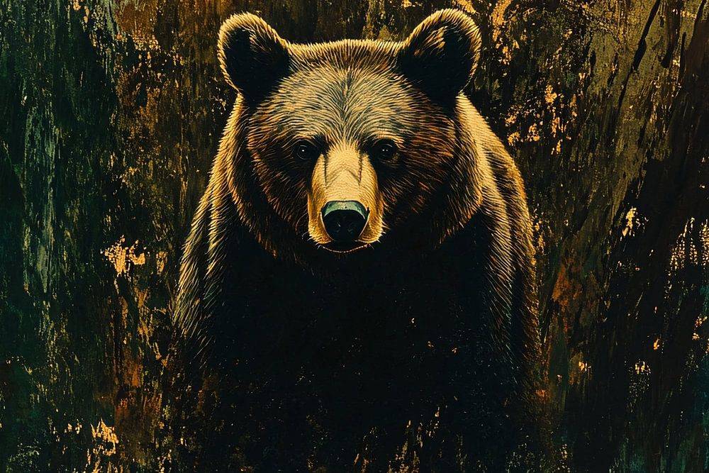 This design captures attention with an imposing bear that seems to emerge from a mysterious, abstract forest. The dark colours and gold accents give it a dramatic and enchanting look, perfect for lovers of modern art with a touch of nature. The powerful image exudes calm and strength and makes an impressive focal point in any room. The combination of the bear and the abstract forest creates a unique and captivating work of art that will appeal to nature lovers and art enthusiasts alike. Ideal for the living room, dining room or office space to add a touch of mystery and power.