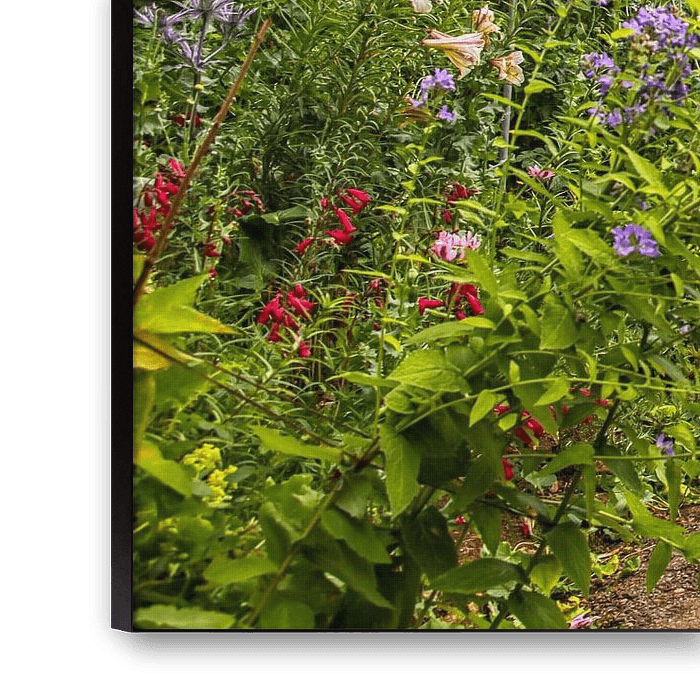 Lush English garden with colourful flowers and a path in the middle at Sudeley Castle in England