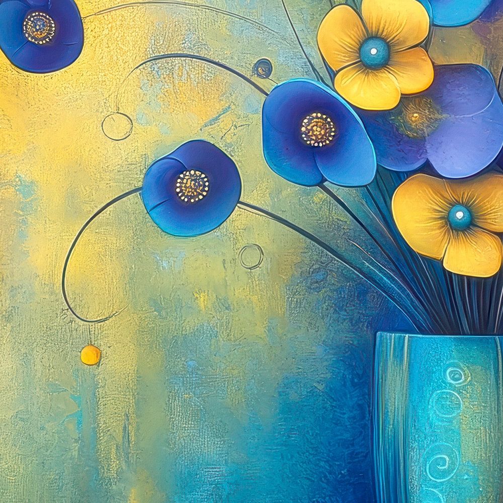 A bright bouquet of blue and yellow flowers is elegantly arranged in a tall, blue vase against a textured, abstract background. The interplay of cool and warm colours creates a striking contrast and highlights the delicate details of the floral arrangement.