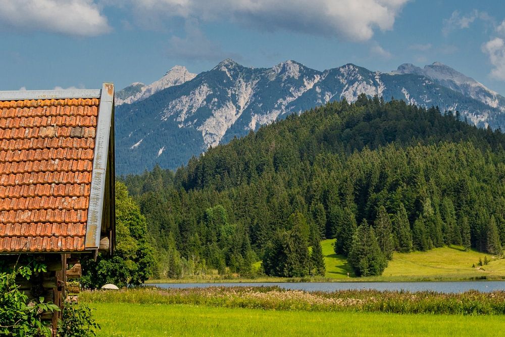 Beautiful lake landscape at the Wagenbruchsee in the alpine foothills of Bavaria