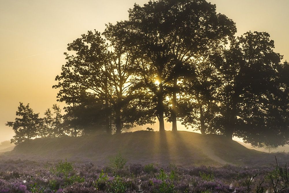 Beautiful moorland It Mandefjild near Bakkeveen. The photo was taken early in the morning. The sunbeams are just visible behind the trees. There is still fog hanging over the heathland.
