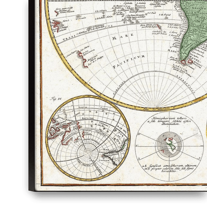 Decorative historical world map from 1746 by George Maurice Lowitz. Replica of the original engraving in beautiful colors. Shows not only the two hemispheres but also other perspectives of the globe. The text blocks on this poster are richly decorated with animals and mythical figures.