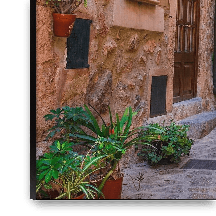 Buy this flower art Beautiful street in the mediterranean village Valldemossa on Mallorca, Spain by Alex Winter on canvas, ArtFrame, poster and wallpaper, printed on demand in high quality.