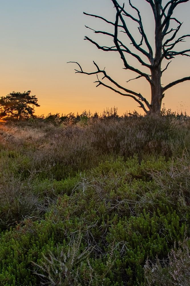 One of my favorite times to photograph is during sunset. This is when the sky turns a beautiful blue and the setting sun adds an orange glow to the sky. During this summer walk I came across this beautiful purple heather where a beautiful dead tree stands. In the background you can still see the sun setting beautifully.