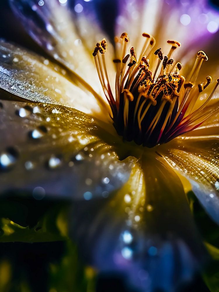 Close up of a gorgeous blue and yellow flower with water drops