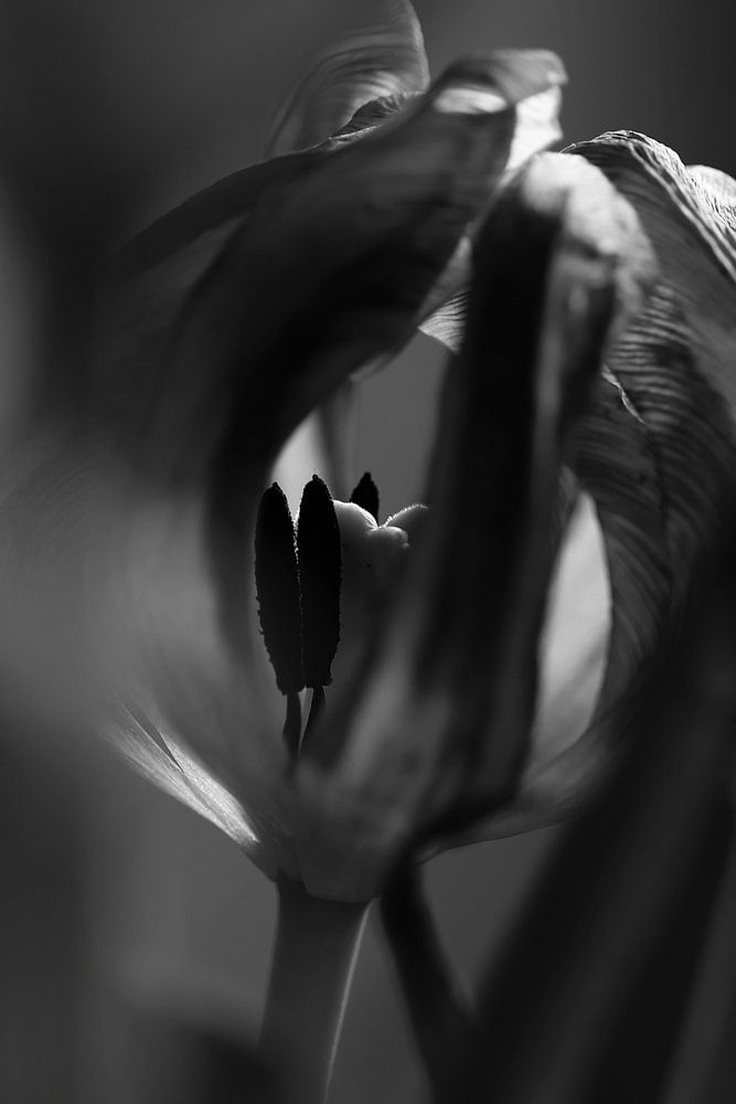 As the leaves slowly wither, the tulip in the picture falls open beautifully, showing off its inside beauty to the world. The subtle sunlight highlights the beautiful textures in the withered leaves and the shapes of the pistil on the inside of the flower. The use of black and white adds to the mystical, veiled, atmosphere of the photo.