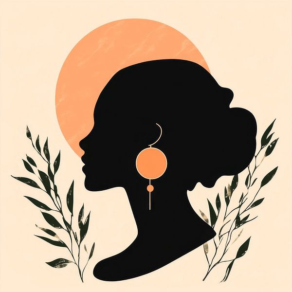 The picture shows the stylised silhouette of a woman, framed by delicate plant motifs. A soft, orange semicircle in the background symbolises the sun and enhances the warm atmosphere. The elegant earrings, which add a touch of grace and style, and the harmonious composition, which radiates beauty and tranquillity, are particularly…