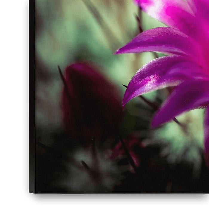 Beauty macro cactus with purple flowers and spines with bokeh details and closeup