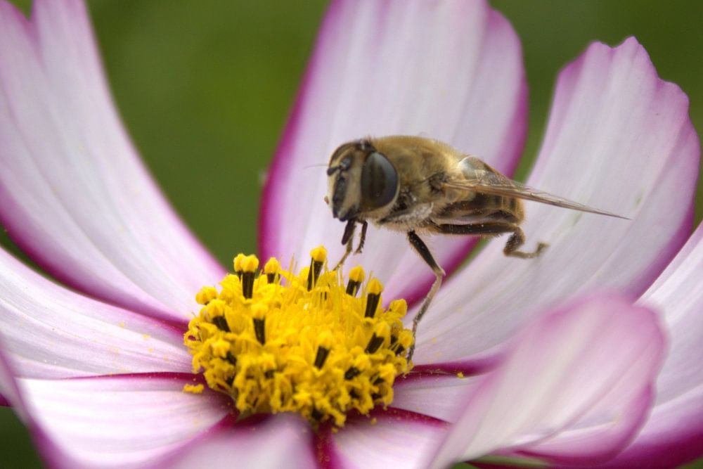 This captivating photo shows a close-up of a bee sitting on a beautiful pink Cosmos flower. The flower's vibrant pink petals radiate elegantly outwards, framing a bright yellow centre dotted with pollen. The bee, detailed and sharp in focus, appears fully concentrated as it actively collects nectar, a crucial task that contributes to the delicate ecosystem. The fine hairs and distinctive stripes on the bee's body are clearly visible, highlighting the complexity and beauty of this tiny insect.