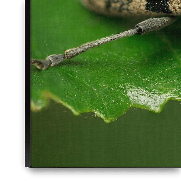 A longhorn beetle cleans one leg on a leaf.