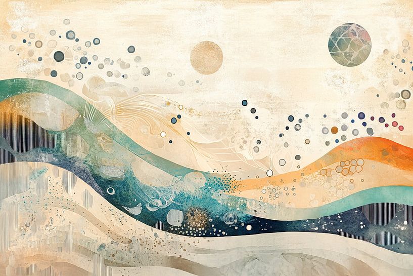 Beige Zen - This abstract painting shows a harmonious mix of circular and wavy elements in a calm beige, blue and orange colour palette, giving a calming Zen look.