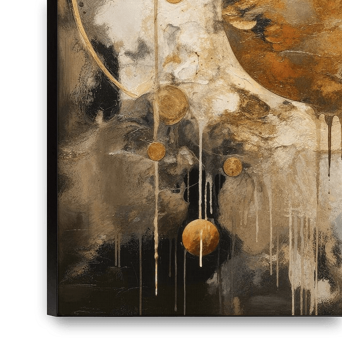 An abstract painting in beige, brown, and gold with geometric shapes exudes tranquility and balance. This abstract artwork brings warmth and natural elegance to your home, giving any space a harmonious look.