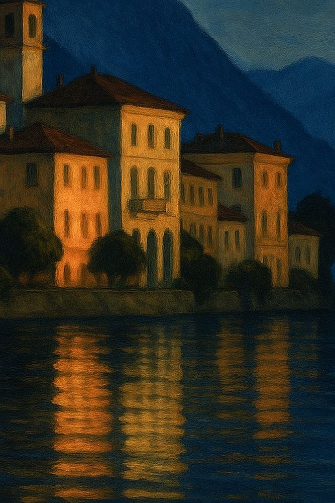 The painting’s symmetry offers peace, while its emotional tension gives it depth. Bellagio becomes not just a place but an idea — a dialogue between isolation and harmony, between human creation and natural immensity.