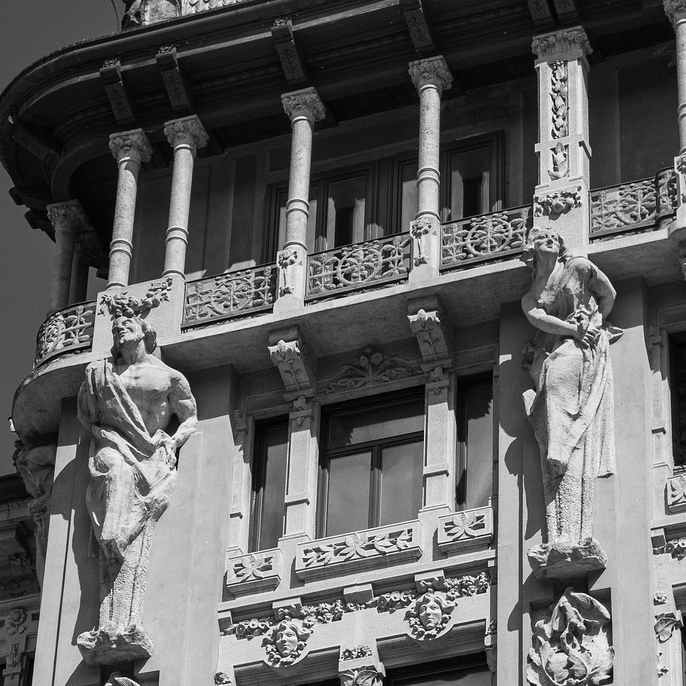 The Grand Hotel in San Pellegrino Terme, near Bergamo in Lombardy, Italy, captures the timeless elegance of Belle Epoque architecture. The beautiful facade of this ornate building showcases intricate architectural details including statues and decorative elements around the windows. It is an architectural jewel of the Belle Epoque period. Here captured in black and white, emphasizing the contrast and textures of the ornate structure.