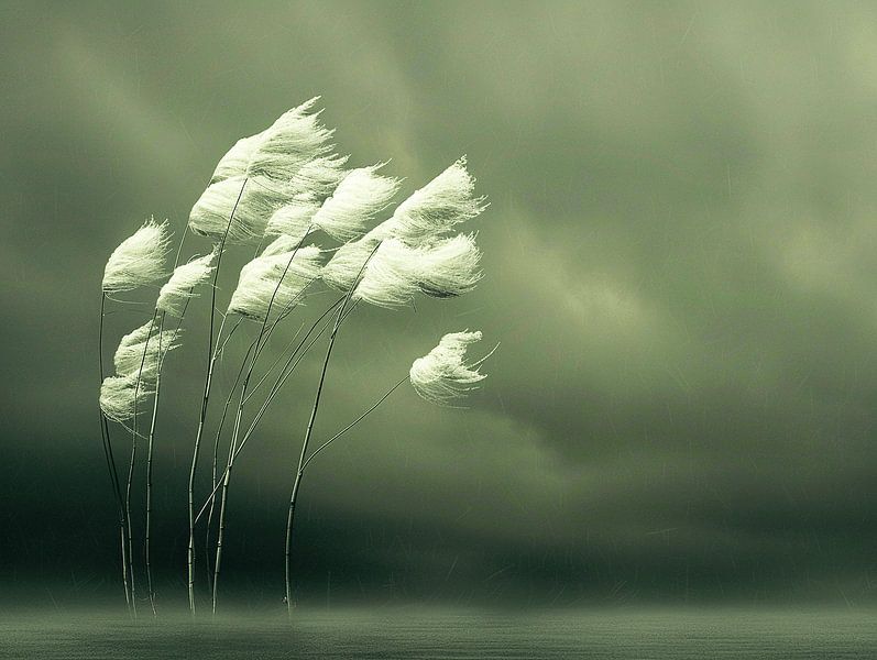The wind howls, the sky darkens — and the reed plumes bend with it, supple and undisturbed. This work is about resilience without ever mentioning the word. The movement is almost palpable: you can see the stems swaying, the plumes fanning out like wild hair in a storm. And yet everything remains standing.
